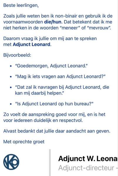 Op een middelbare school in het Vlaamse Opwijk ontstond commotie nadat de adjunct-directeur bekendmaakte non-binair te zijn. In een e-mail aan het schoolteam en later ook aan leerlingen legde de persoon uit niet langer aangesproken te willen worden als “meneer” of “mevrouw”. De school besloot daarop de neutrale aanspreekvorm “adjunct” te gebruiken, zodat iedereen zich comfortabel kon voelen.